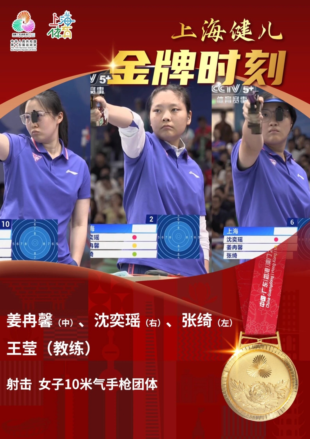 在女子射击10米气手枪团体项目上,静安区培养输送的运动员沈奕瑶稳定发挥,助力上海队摘得该项目金牌,这也是沈奕瑶射击生涯中获得的第二枚全运会金牌。