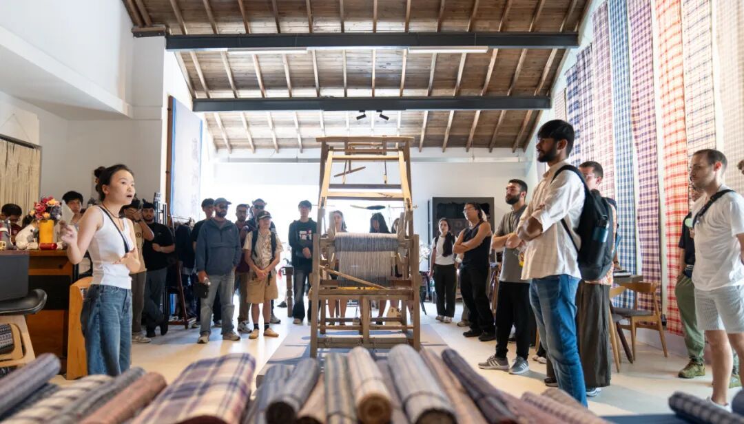 何超欣所穿的改良版土布服饰,出自竖新镇布布瀛染织非遗传习所(以下简称为“布布瀛”)。布布瀛位于竖新镇惠民村,是崇明一家土布文创手工制作体验基地,致力于土布的收集、整理和创新活化。近年来,布布瀛将传统技艺与现代设计结合,创作出服装、玩偶、家居用品等众多土布时尚单品,使土布走出展馆,走进现代生活。