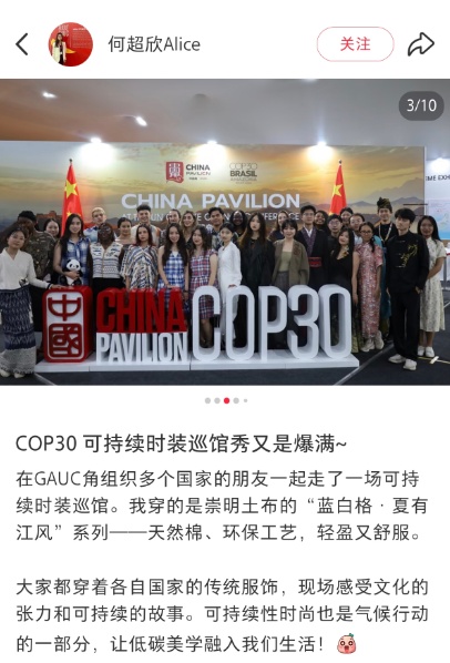 近年来,何超欣积极投身可持续发展领域,是推动气候行动的新鲜血液。她在接受采访时表示,崇明土布是崇明岛上的传统手工织物,采用天然棉纺、手工织造的低碳工艺,纯棉布料轻盈透气,穿在身上非常舒适。“之所以选择崇明土布制作的服装参加活动,是因为崇明土布的环保材质和减碳工艺,与可持续理念完美契合。穿上这样具有历史厚重感的环保服装走上国际舞台,能向世界传达中国传统文化中蕴含的环保智慧。”
