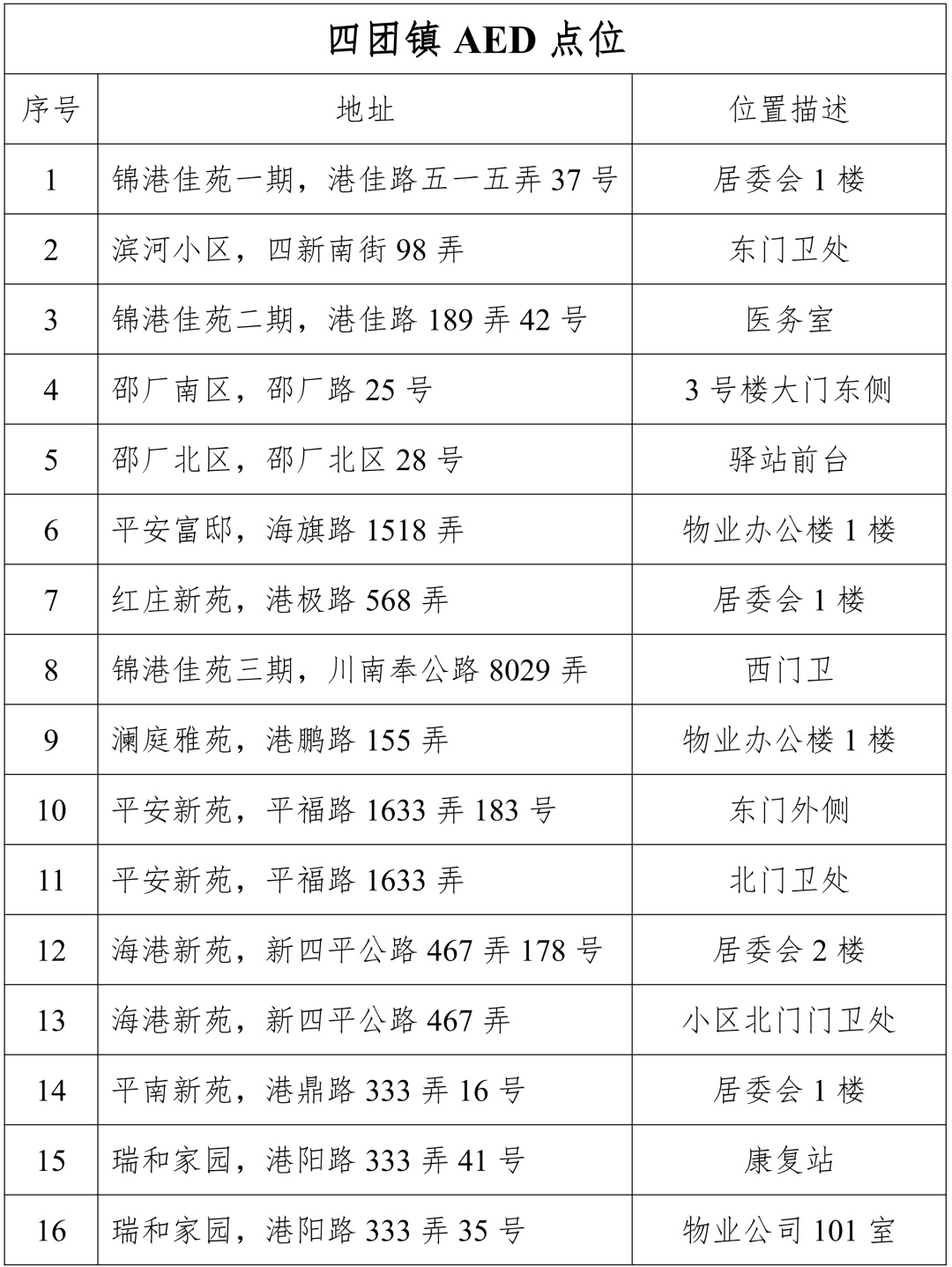 文末附上四团镇AED设备详细点位表,建议您保存并分享给家人与朋友,共同关注身边的生命急救资源。