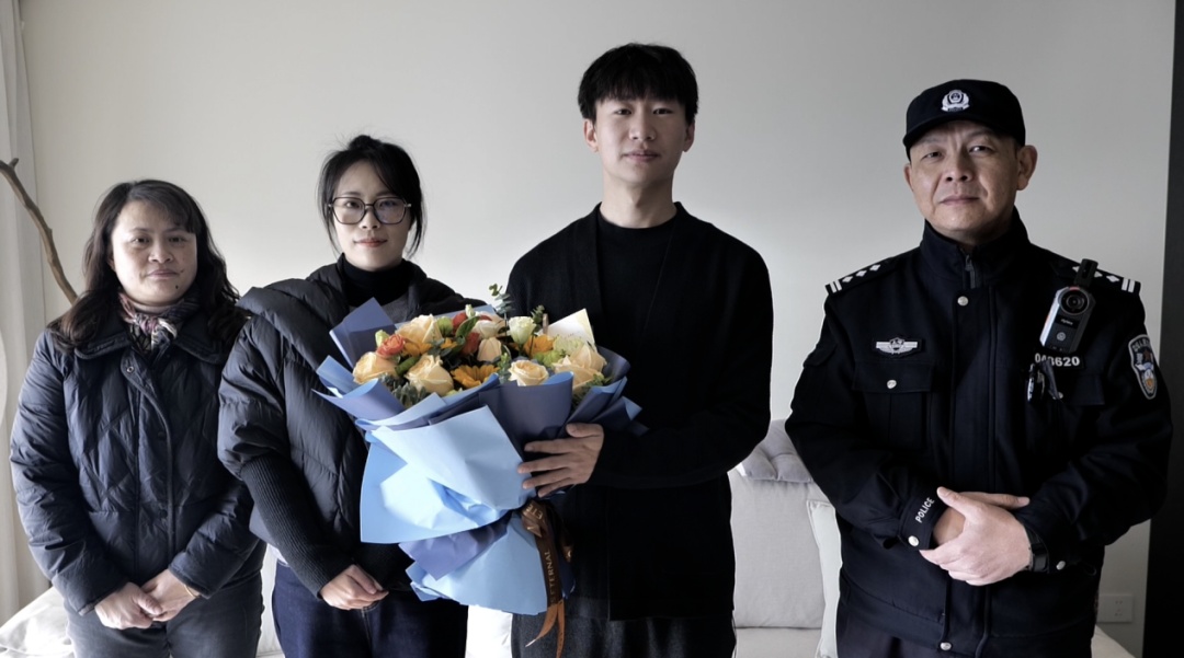 12月17日,南翔镇白鹤社区居委工作人员与社区民警,专程来到救人者之一的援青教师秦庆轩家中,向他送上鲜花与敬意。原来,在11月23日晚10点左右,南翔镇人民街五泾桥上一名女子落水,秦庆轩与另外两名同伴迅速将桥边横幅拧成一股“生命绳索”,合力将女子拉上岸。
