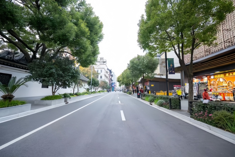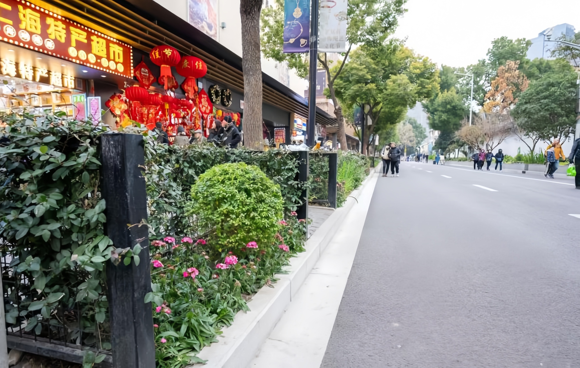 同时,美丽街区改造中沿福佑路人行道新增连接带绿化。豫园围墙外,融合红枫、桂花等传统园林植物,结合街区空间尺度,打造移步换景、自然雅致,兼具古典园林风格的生态景观带。