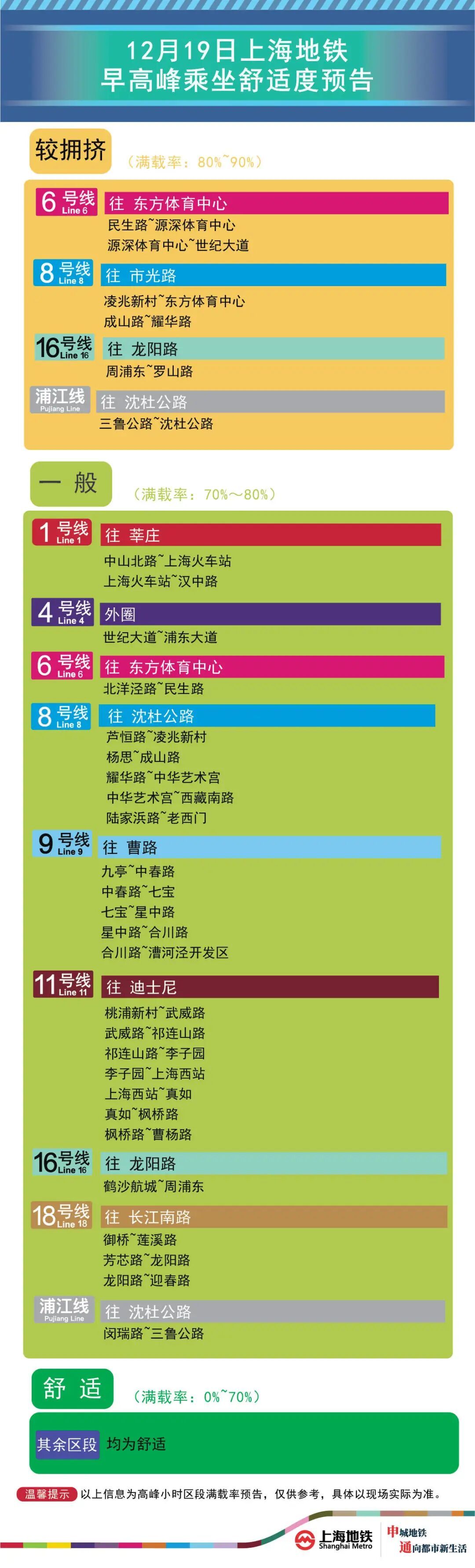 为提升上海地铁早高峰期间出行服务水平,提升乘客乘坐体验,上海地铁向乘客提供乘坐舒适度预告,方便乘客提前做好出行准备。