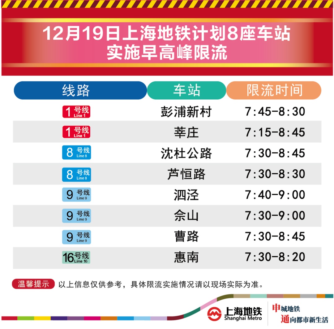【编辑】范范12月19日,上海地铁早高峰限流措施将继续实施,届时将有8座地铁站早高峰计划限流。