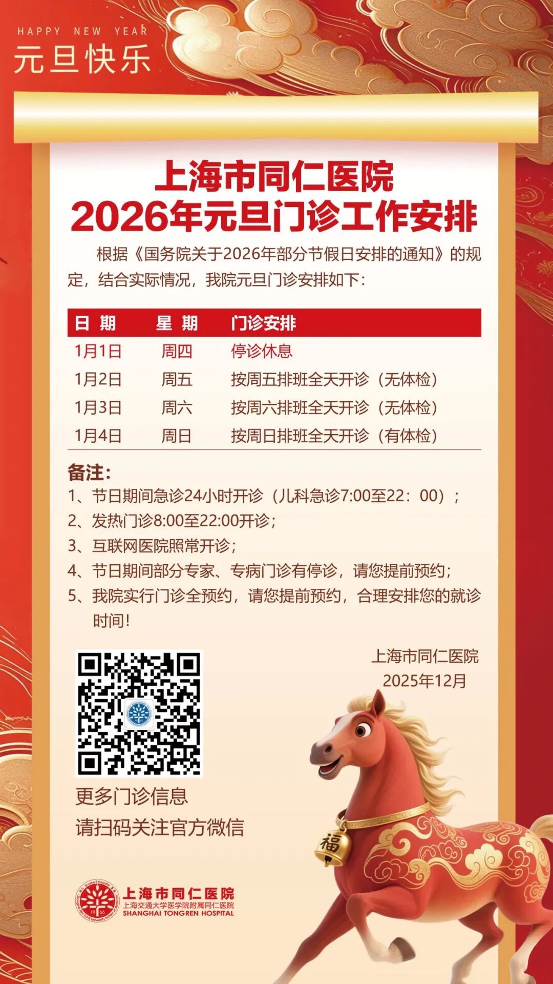 【通知】上海市同仁医院2026年元旦门诊工作安排