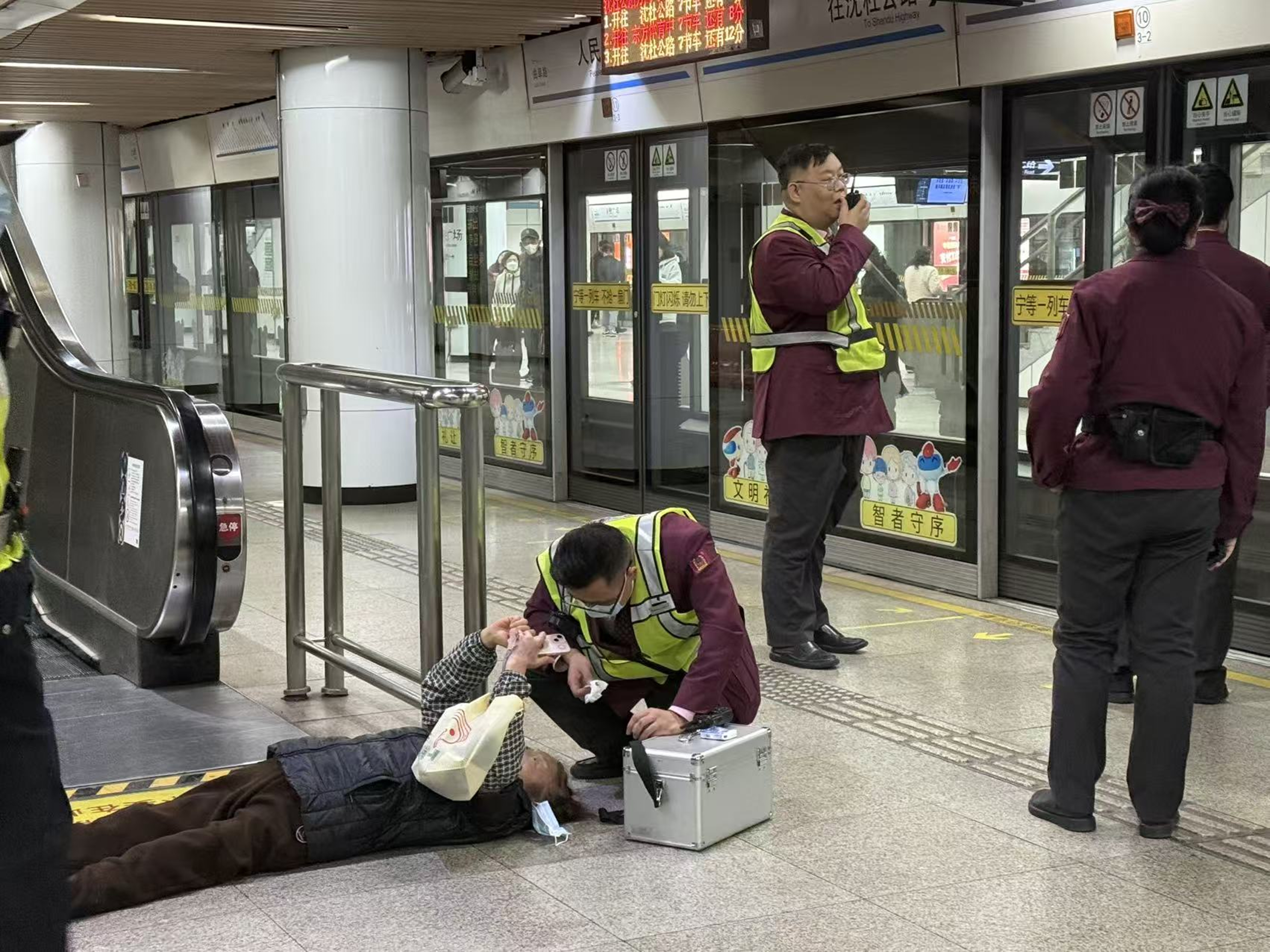 当天,人民广场站值班站长徐俊和邓胤正在站内进行日常巡视。突然,一阵急切的呼救声打破了车站的平静。两人顺着声音的方向迅速赶去,发现一名老年乘客在8号线小站台的自动扶梯上摔倒。此时,乘客表情痛苦,身体无法自行站立,情况十分危急。