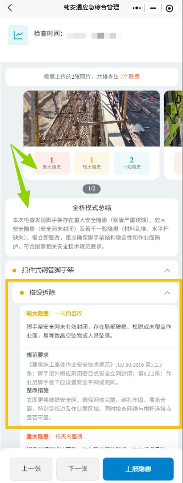 “建筑施工、楼栋外墙面修复、非报监工地等场所,一向是安全监管的难点。为了解决传统人工巡查效率低下、隐患识别不全的问题,‘菊安通’数字化应急综合管理系统依托移动端微信小程序,特别开发了AI智能隐患排查助手的新模块,旨在构建起‘智能识别、专业辅判、闭环整改’的全流程管理体系,为安全监管注入科技动能。”菊园新区城运中心主任钱盈介绍。