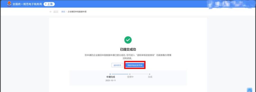 等页面跳转到 “提交成功” 界面,就说明撤回申请已经提交完成啦!可以点击“退税审核进度查询”随时查看审核是否完成哦!