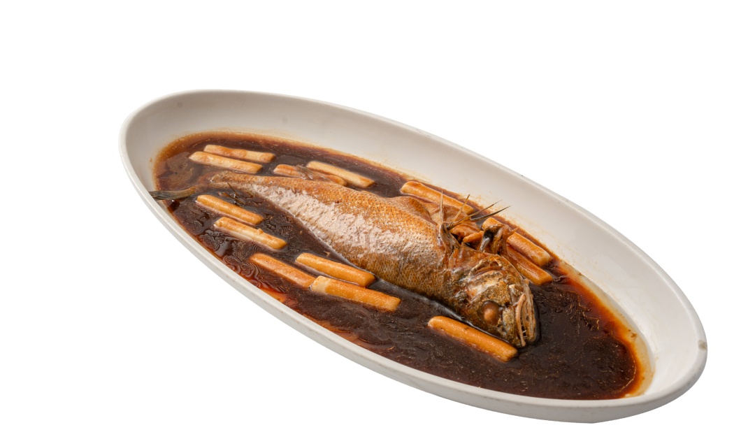 渔民的家常烧法,仅用葱姜酱糖小火慢煨。鱼肉呈蒜瓣状,嫩滑肥腴,汤汁咸鲜微甜,是代代相传的经典味道。