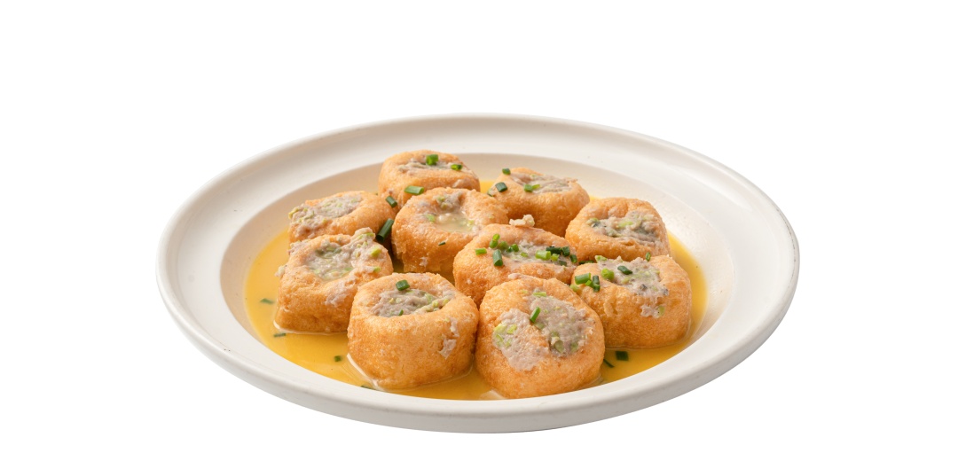 方正的油豆腐里塞满紧实肉馅,加入高汤小火慢焖十五分钟,使豆腐饱吸汤汁,肉馅鲜香滚烫。一口下去,肉馅鲜甜,豆皮香润,温暖满足。
