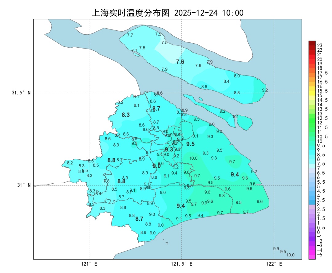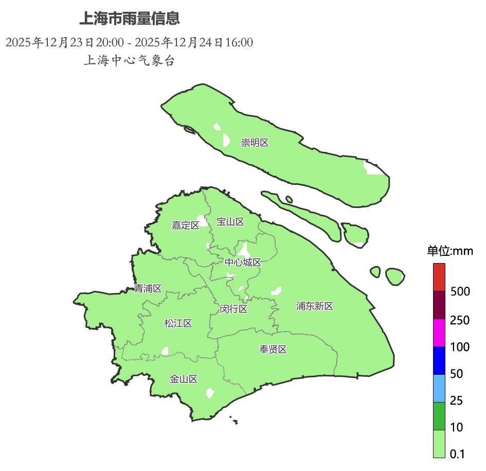 受冷空气影响,上海今天普降小雨。昨天20时到今天16时雨量统计显示,金山吕巷镇4.5毫米为最大。全天温差小,市区徐家汇站白天(8~17时)最高气温仅9.3℃,最低气温8.5℃。目前,崇明、嘉定、青浦、松江、金山、奉贤的寒潮蓝色预警信号持续生效中。预计今天夜里逐渐雨止多云。