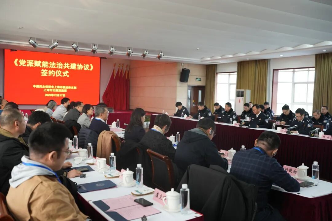 在全场嘉宾见证下,北新泾监狱与中国民主促进会上海市委员会综合委法律支部签署《党派赋能法治共建协议》,双方交换文本并握手合影,定格共建时刻。