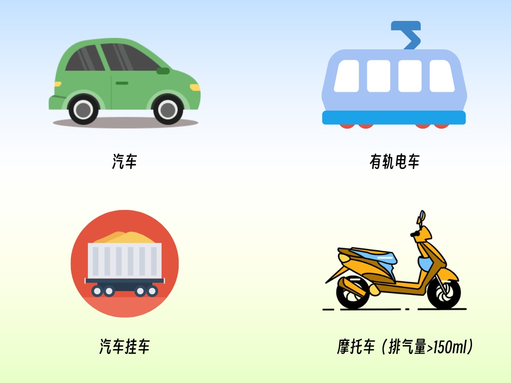 应税车辆:汽车、有轨电车、汽车挂车、摩托车(排气量>150ml)