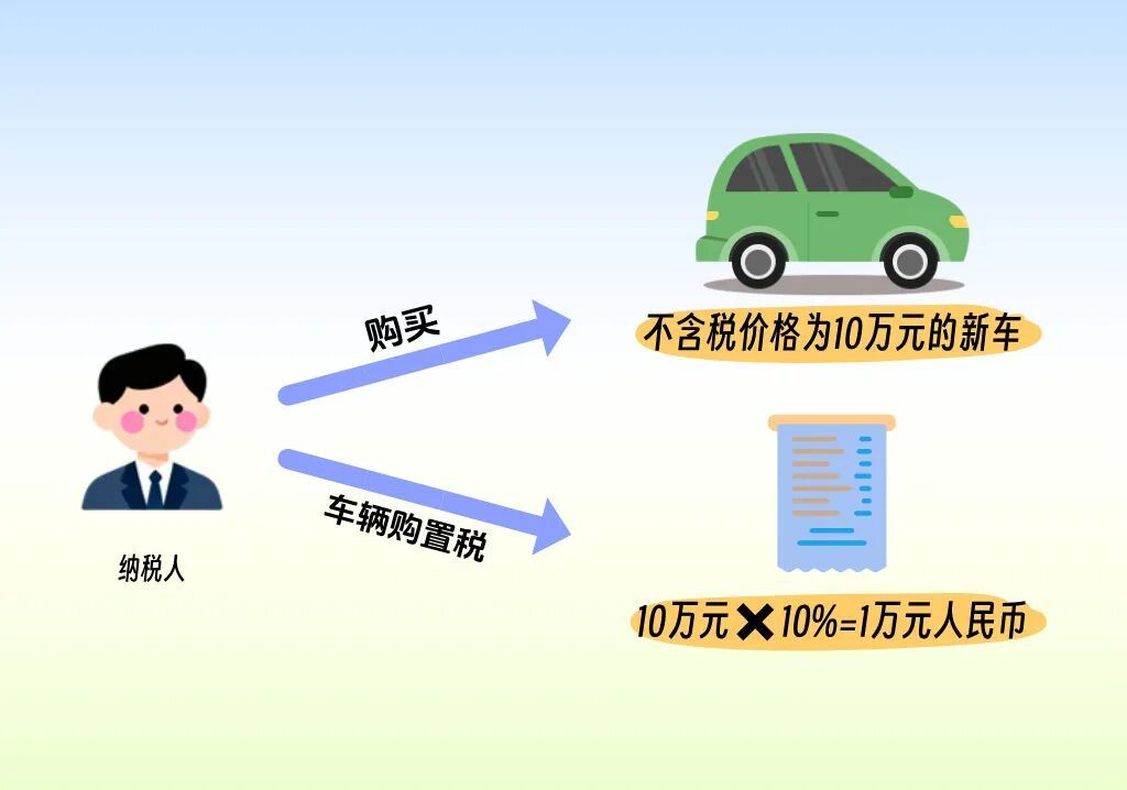 例如,纳税人购买了一辆不含税价格为10万元人民币的新车,那么应该缴纳的车辆购置税就是10万元的10%,即1万元人民币。