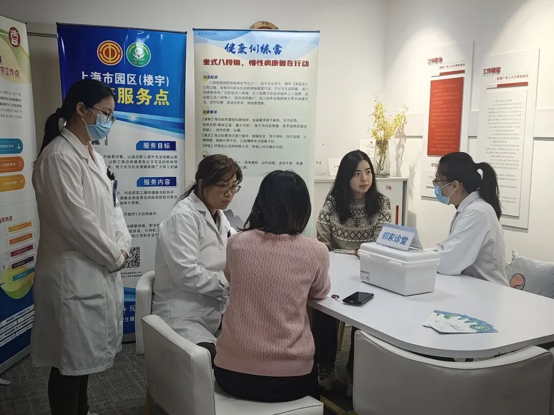 午休不再只有外卖,还能把脉问诊、学八段锦—— 近日,在曹家渡街道党群服务中心的推动下,曹家渡街道社区卫生服务中心党支部携手智慧广场党委,将“邻家诊堂暖楼宇”主题党日活动直接搬进商务楼宇,将专业医疗服务送到了白领身边。