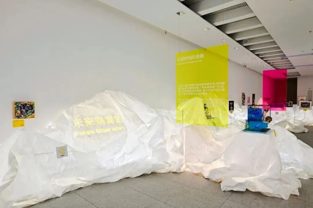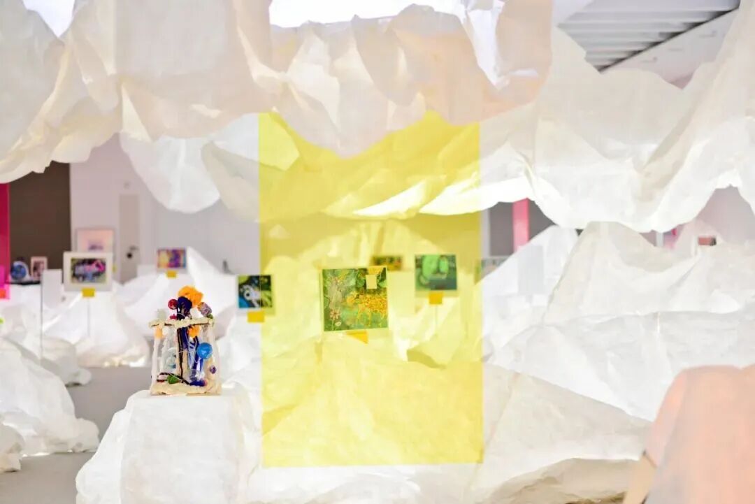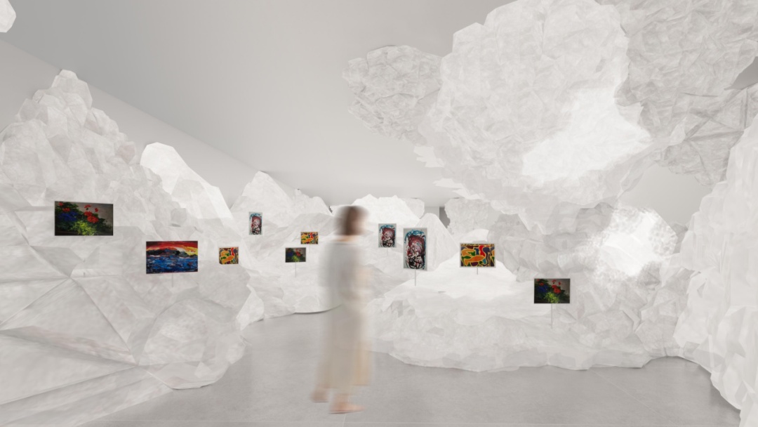 浦东美术馆邀请著名工业设计师杨明洁担任本次展览的展陈设计师。展览动线由入口“虚山水”装置进入到一个梦幻空间,白色半透的特卫强纸质材料贯穿全场,通过裁剪、褶皱、堆叠、悬挂等方式塑形,带有呼吸感的背透光效设计增加了现场质感与互动趣味,让观者仿佛置身于一个穿越时空后的超现实虚构世界。
