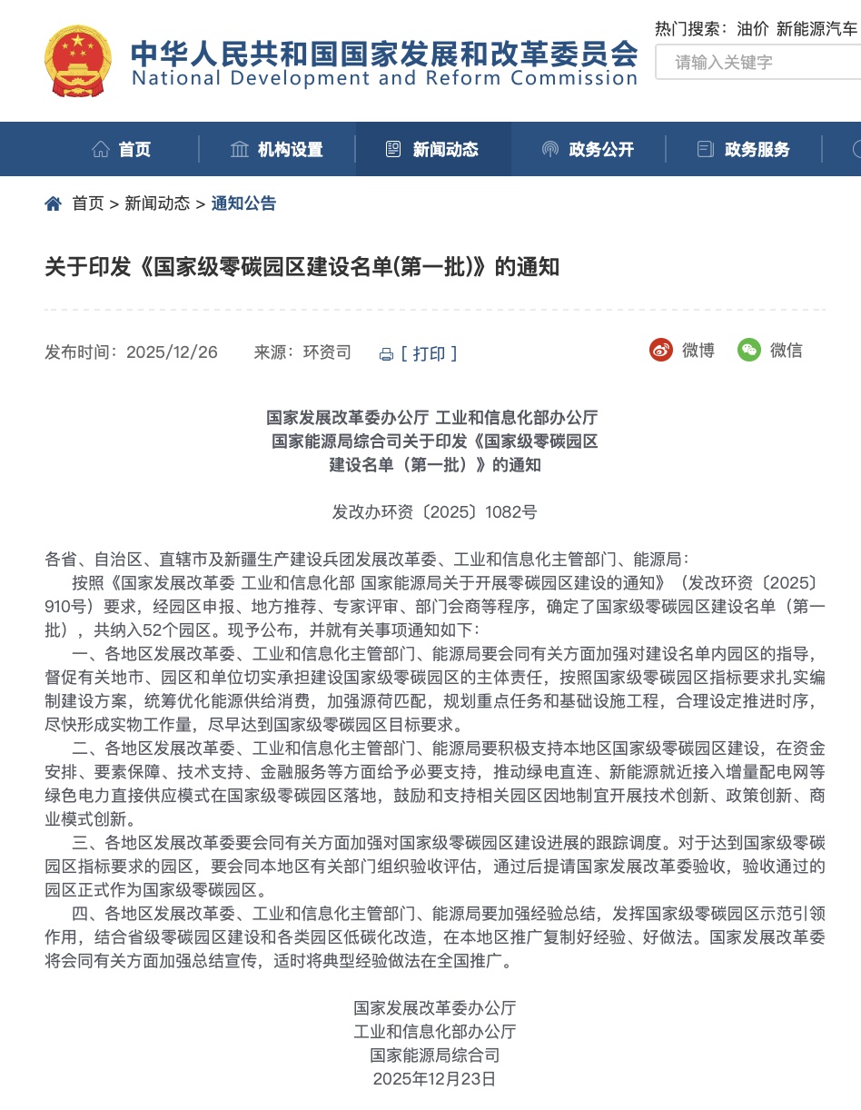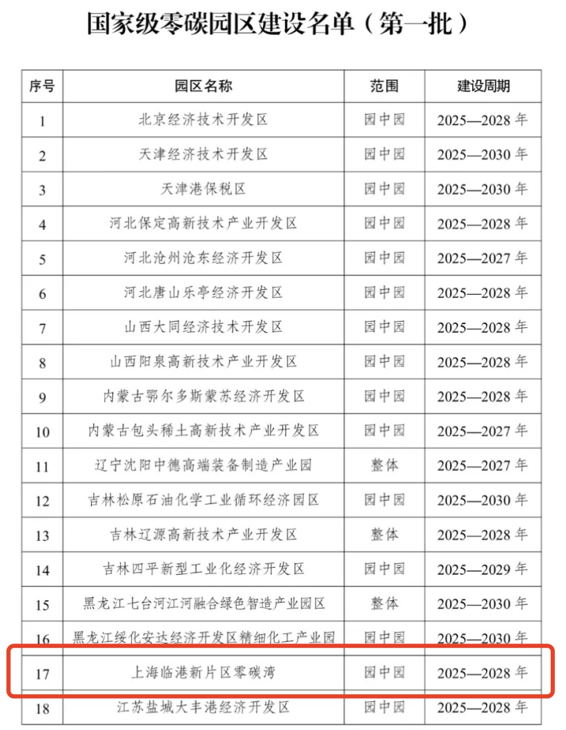 12月26日,国家发展改革委办公厅、工业和信息化部办公厅、国家能源局综合司联合发布《国家级零碳园区建设名单(第一批)》(发改办环资〔2025〕1082号),上海临港新片区零碳湾成功入选,成为全国首批52个国家级零碳园区之一,上海市目前首个并且唯一获批的国家级零碳园区。这是临港集团积极落实国家“双碳”战略、推动园区绿色低碳高质量发展进程中的重要里程碑。