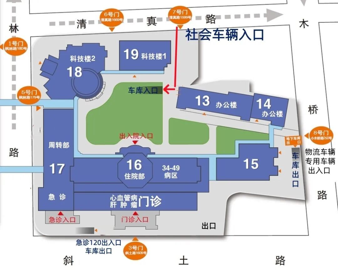 三、小木桥路 250 号:为院内物流车辆、专用车辆出入口,以及其他社会车辆车库出口。