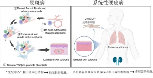 杨骥教授团队在大量的临床病理切片观察中意外发现硬斑病病灶内淋巴细胞聚集成巢,而系统性硬化症皮损中此类现象相对少见。进一步结合多重免疫荧光染色和单细胞测序分析,团队发现硬斑病病灶内的淋巴细胞聚集成巢形成“生发中心”样特征的三级淋巴结构,该结构驱动局部纤维化发生;同时,在整合素等的介导下,该生发中心样结构长期滞留于局部皮肤,使纤维化主要局限于生发中心样结构周边。而在疾病谱的另一端,系统性硬化症几乎没有这种淋巴细胞聚集成巢的生发中心样结构。相反,团队发现在系统性硬化症患者皮肤和肺部等多器官中存在一群高胶原合成的Creb3L1阳性的成纤维细胞,驱动着多器官发生进行性纤维化。在硬皮病小鼠模型中抑制Creb3L1可有效缓解小鼠皮肤及肺纤维化程度,改善硬皮病小鼠预后。