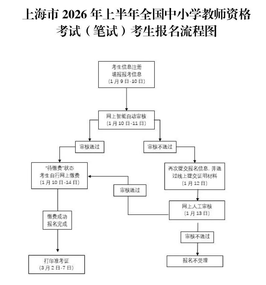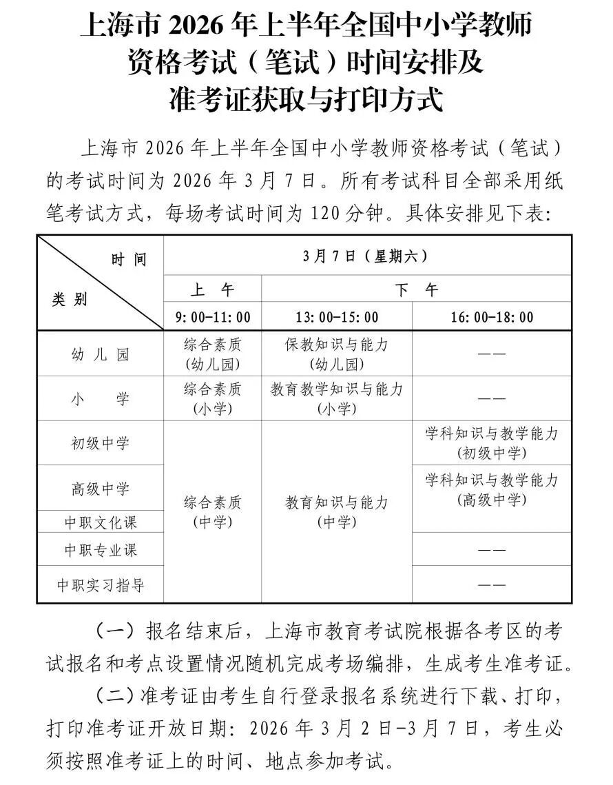 根据教育部统一部署和上海市教育委员会有关文件精神,2026年上半年全国中小学教师资格考试(笔试)将于2026年3月7日举行(考试时间安排及准考证获取与打印方式见下方)。