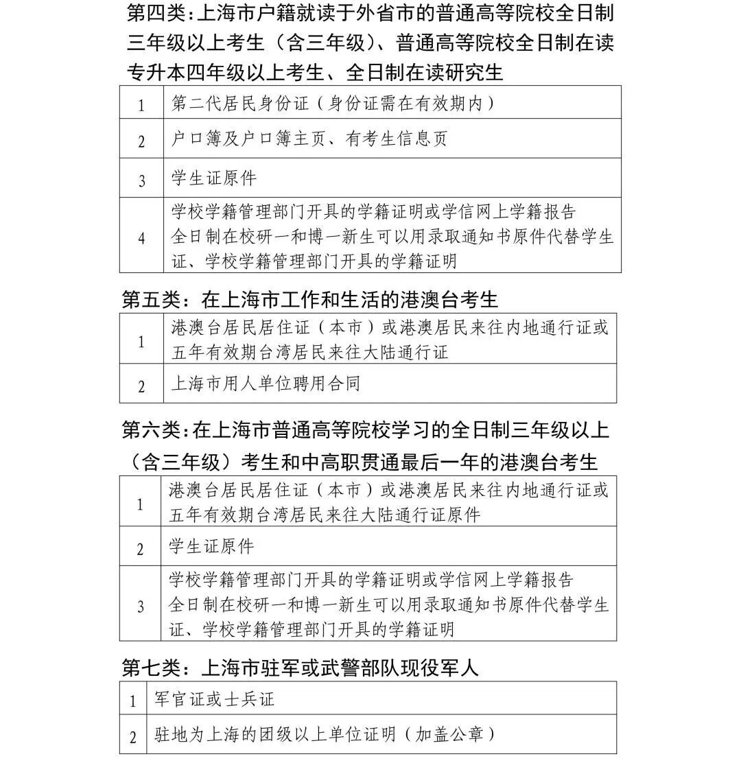 (五)上海市普通高等院校以及户籍在上海的外地普通高等院校全日制三年级(含在读专升本第四学年)及以上考生和全日制在读研究生,中高职贯通考生允许在其学习的最后一年报考。