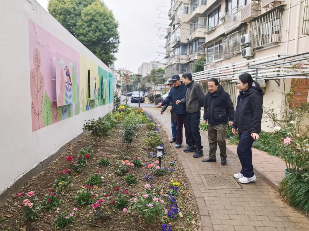 从清理场地、墙面美化,到绿植选择、添置花架插牌,打造“绿意漫享道”前后的每一个细节都凝聚着居民的智慧。通过党建联建,新泾四村邀请园林绿化局针对步道周边绿化的实际情况,给予种植品类和技术的专业指导。11号楼竺阿姨提出“选种低矮绿植更能衬托墙绘”的建议,立刻得到认同,居民一同筛选种植了合适的月季、栀子花等。