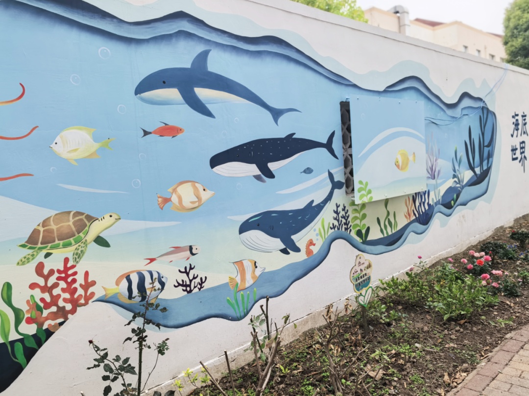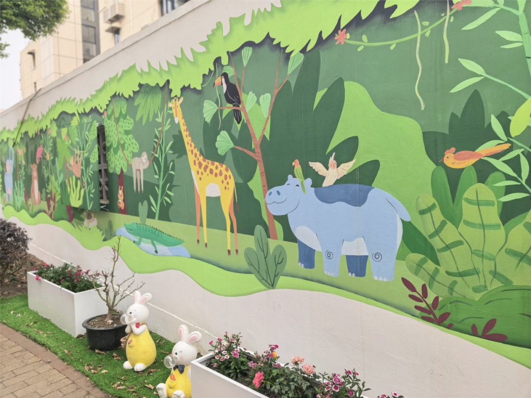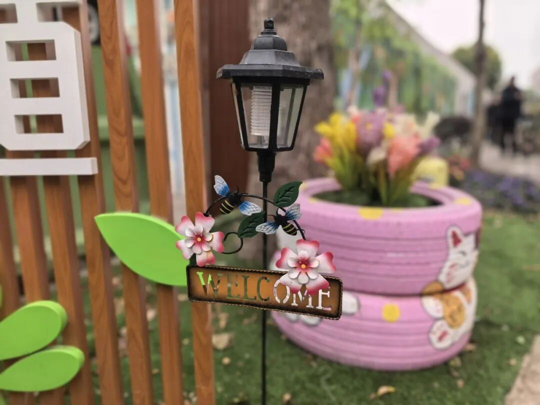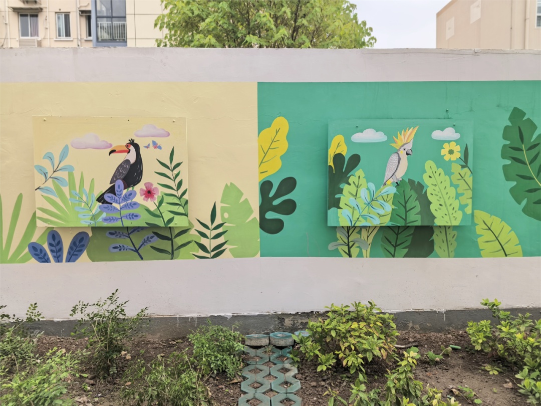 主入口处,新增主题门头,巧妙设计的文字样式充满活力感;创意花坛由回收轮胎制成,绘制了向日葵、小猫咪、宇航员等童趣图样,插上仿真花后更显生机;彩绘墙结合海陆空元素,墙面上画满了惟妙惟肖的动植物,多层次的立体画风让人身临其境;特别安装的雨水收集装置,建立起微循环的滴灌系统,让环保理念在社区“生根发芽”;新添置的太阳能景观灯,白天储存绿色能源,晚上自动开启照明,兼具美观和实用性。