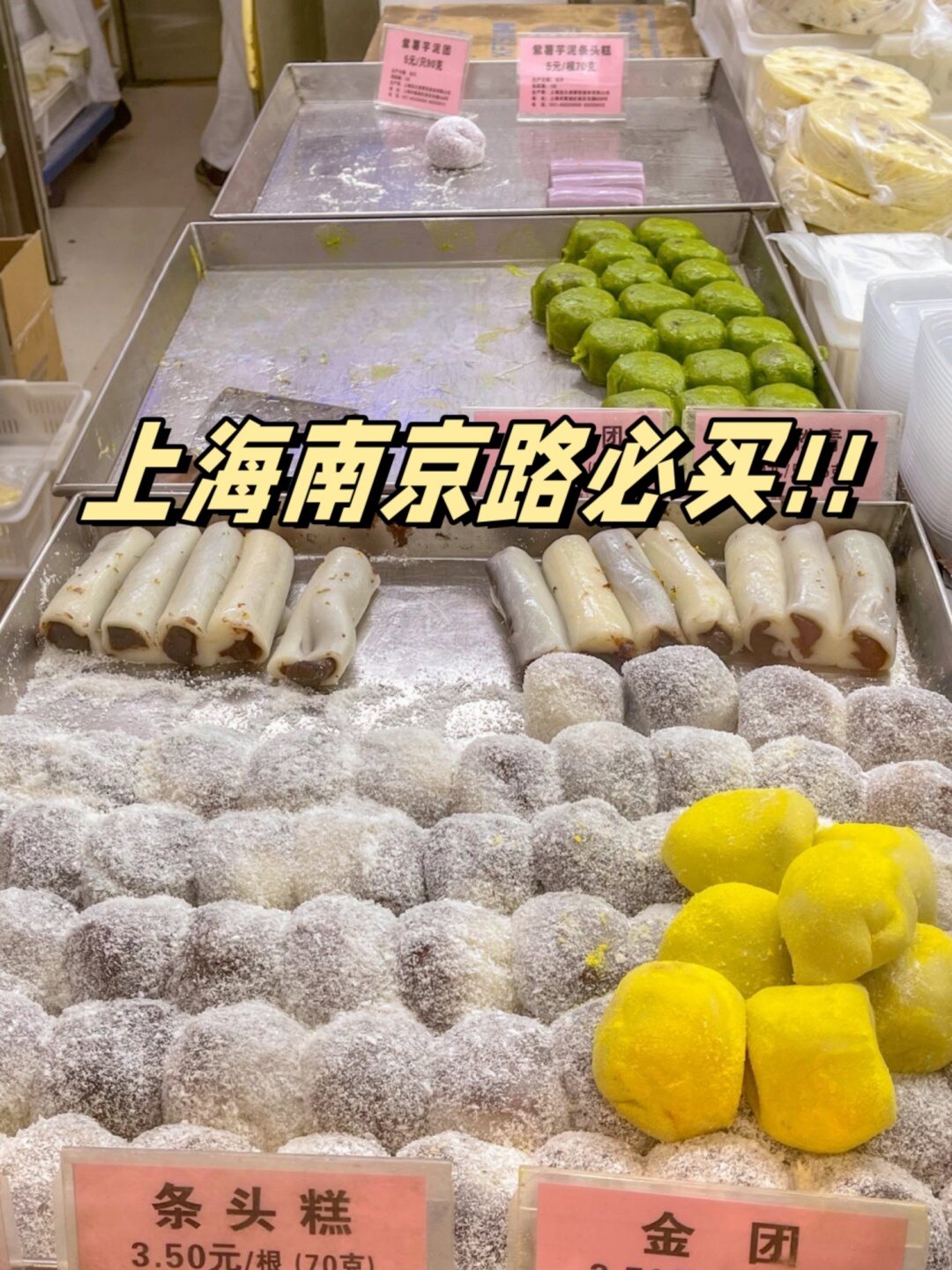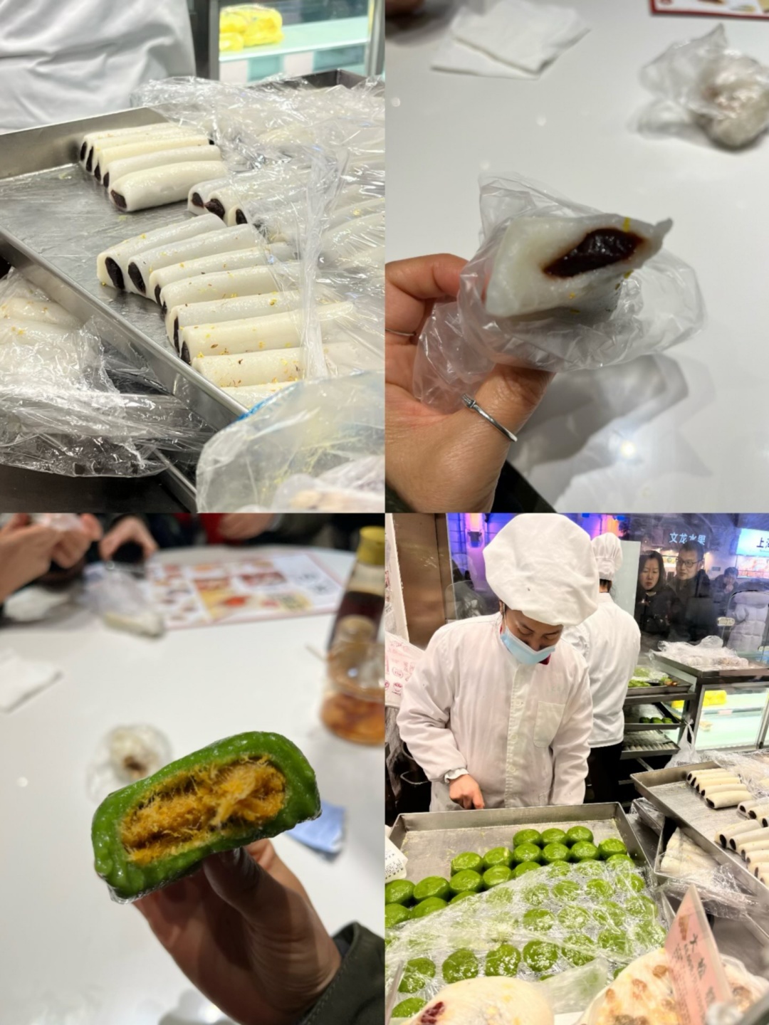 沈大成的窗口内陈列着各式各样的糕团,散发着诱人的香气。寿桃、寿糕、桂花条头糕、双酿团、青团等经典美食无一不是手工制作,保持着传统的口感和味道,有着上海几代人的味觉记忆。窗口内的售货员快速而准确地为顾客选购糕点,熟练的动作传承着世代相传的手艺。这家老字号,见证了上海的发展和变迁,也见证了百年非遗技艺的传承与创新。