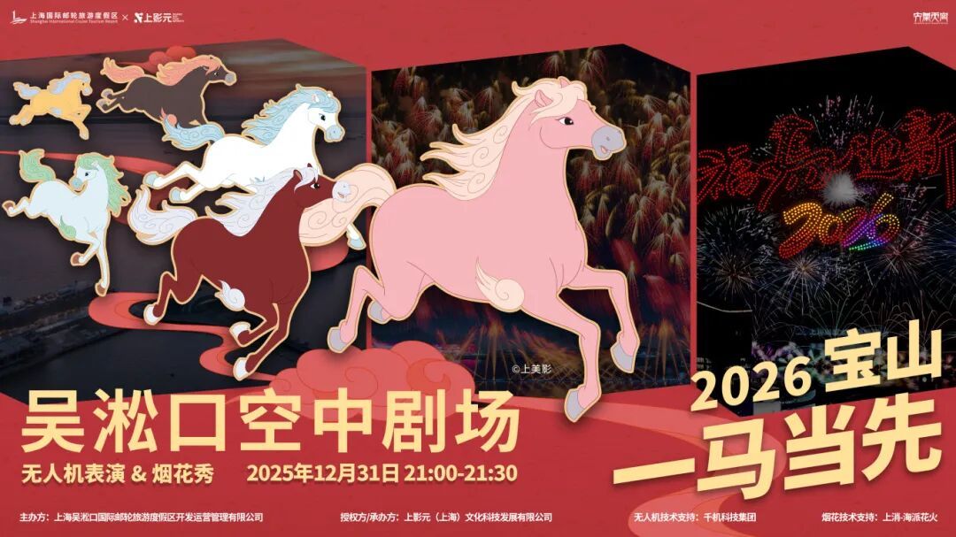 12月31日,吴淞口空中剧场将以无人机+烟花演绎“2026一马当先”,多架无人机升空,变换各种造型,秀出多样表演,新年仪式和赛博未来感拉满! 岁末的钟声即将敲响,站在时光的交界,让我们充满仪式感地出发,到新的自由和喧嚣中去~