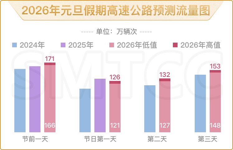 元 旦 假 期 Happy new year 通行政策 元旦假期将至,广大市民外出游玩、返乡团聚一定要把安全记心间。2026年元旦假期为1月1日(星期四)至1月3日(星期六),节日期间高速公路不施行小型客车免费通行政策。 Happy new year 高速公路 预计元旦假期,本市高速公路日均车流量达132-137万辆次。 (数据来自市交通委指挥中心) 预计青浦区出城车流高峰出现在节前12月31日17时至20时,节日最后一天为返程高峰。青浦区G50沪渝高速、S26沪常高速将迎来大车流,容易出现车辆积压。 Happy new year 假期天气 预计2026年元旦假期先雨后晴,以阴到多云天气为主,假期期间有一次降温过程,部分地区温度可能下降至-1℃左右,注意保暖。 Happy new year 热门商圈景点交通指引 百联奥特莱斯商圈 百联奥特莱斯商圈停车场包含P1(1号门)、P4(沪青平/嘉松路口西侧)、P6(佳康路北侧)、合生新天地停车场、熊猫广场停车场等。 朱家角古镇景区 朱家角古镇景区停车场包含课植园路停车场(课植园路555号)、尚都里停车场(油车浜路)、正大大拇指广场停车场(课植园路599弄)、新角里停车场(新风路160号)等。 蟠龙新天地商圈 蟠龙新天地停车场包含内部P1、P2、P3、P5停车场以及进博P12(蟠龙路)停车场。 青西郊野公园 青西郊野公园停车场位于练西公路P1、P2、P3、P4以及P5(大型车辆专用)停车场。 Happy new year 行车安全提示 假期行车要谨记:坚决杜绝酒驾、醉驾,行车时不分心,驾乘人员全程系好安全带。 冬季温度低,车内开暖气,长时间驾驶时易让人产生困倦,所以行车前充足的睡眠不可少。 在高速公路发生事故时,务必做到“车靠边、人撤离、即报警”,车上人员要立即转移至高速公路护栏外安全区域,确保自身安全后再自行协商处理或者等待民警处理,切勿在行车道内停留,防止造成二次事故。 任何时候都应做到车辆不超载、不超速行驶、不违法超车、保持安全车距,冬季行车更要牢记减速慢行。 资料:青浦警坛 编辑:俞静彦
