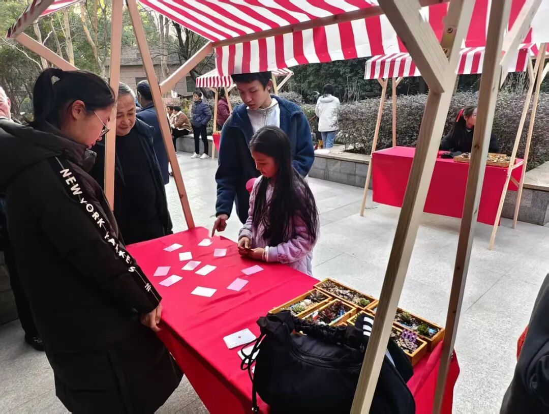 手工体验区则藏着满满的匠心与创意。花样剪纸摊位上,红纸在巧手下翻飞,化作栩栩如生的窗花、福字;手工拓印体验,让大家亲手复刻出古朴的图案,感受传统技艺的魅力;多肉DIY摊位人气爆棚,挑选心仪的多肉植株,搭配精致花盆,一盆盆绿意盎然的小盆栽满载而归,也把生机与希望带回了家。