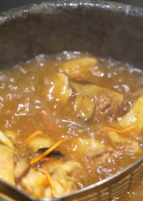 广式打边炉是陶陶居的冬日招牌菜,用猪肉、鸡肉、鸡脚来煲汤底,慢火煲3个多小时。上桌后放猪肚和新鲜鸡肉,再煮5分钟左右,就可以品尝了。