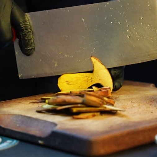 “这个就是网红的见手青,手不要‘调皮’,不能徒手碰它,不然可能会‘见小人’哦。”店内负责人介绍道,见手青刚刚切开来的时候是白色的,1—5分钟之后颜色会慢慢变深。