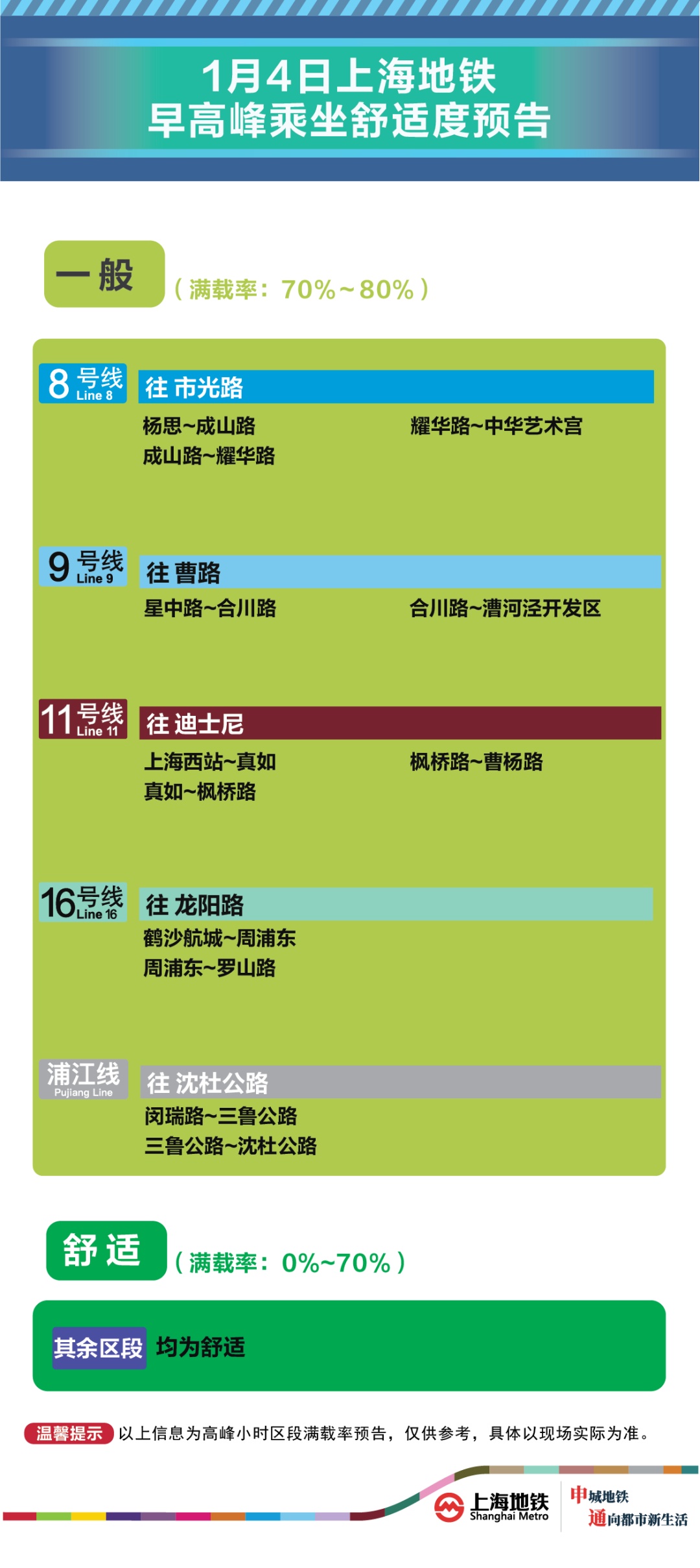 为提升上海地铁早高峰期间出行服务水平,提升乘客乘坐体验,上海地铁向乘客提供乘坐舒适度预告,方便乘客提前做好出行准备。