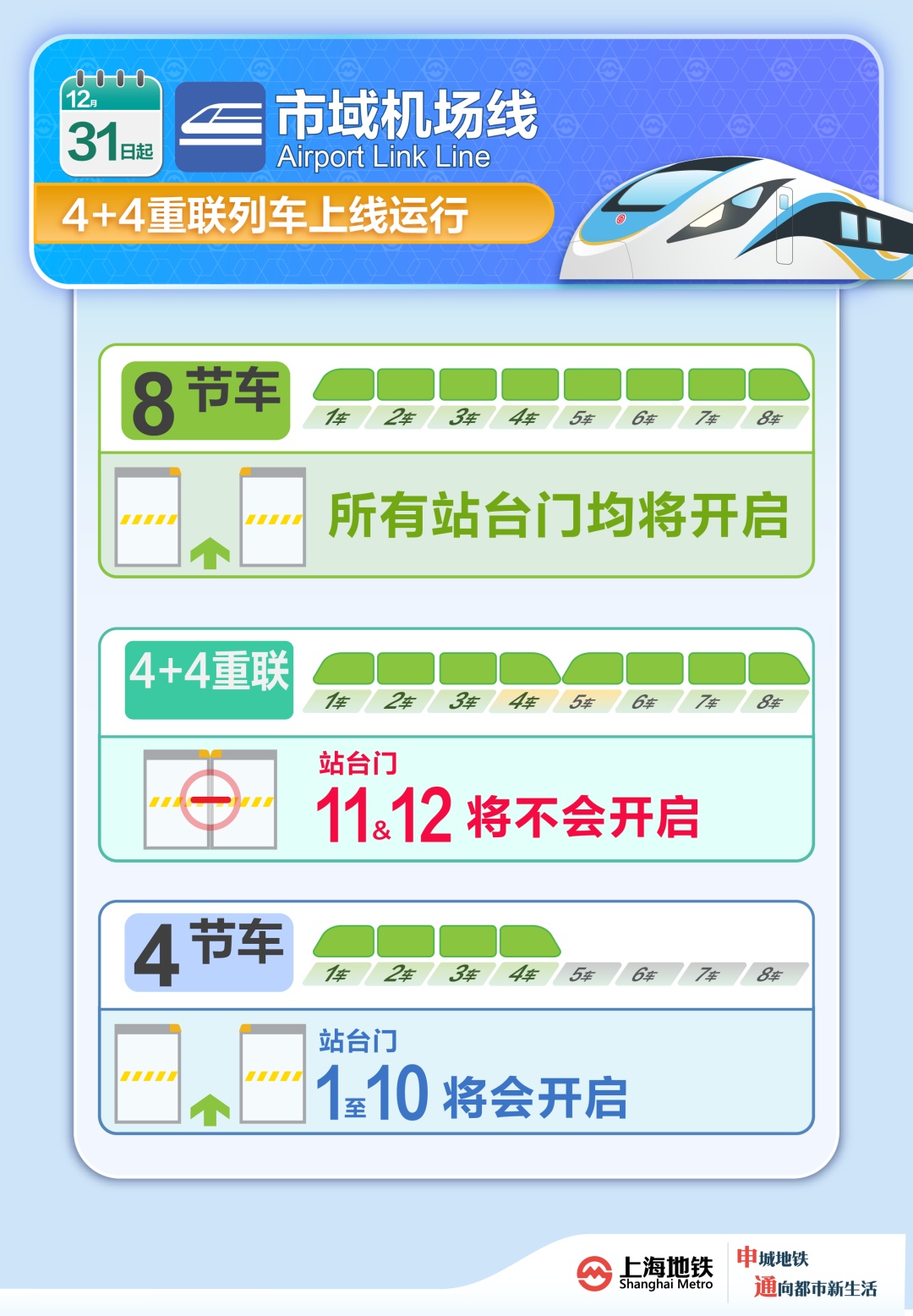 2025年12月31日首班车起,上海轨道交通市域线机场联络线将正式上线国内首列市域C型“4+4”重联编组列车。自此,线路将进入 4编组、8编组、“4+4”重联编组三种模式协同运营的新阶段。为此,乘客等候“4+4”重联编组列车时,请务必注意:列车中部重联处的第11号、12号站台门将保持关闭。 为保障乘降安全与效率,车站已通过新增站台门提示标识、更新广播引导、强化现场服务等方式,协助乘客快速识别。“4+4”编组列车也将按照客流强度灵活调整,请乘客留意引导,避免在第11号、12号站台门处停留等候“4+4”重联编组列车,请前往相邻站台门有序排队上下车。