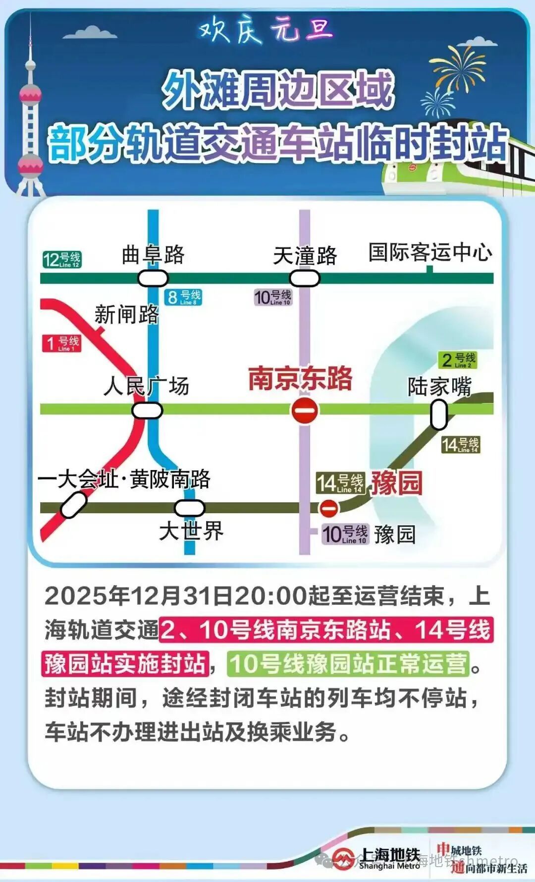 12月31日20:00起 2、10号线南京东路站及14号线豫园站封站