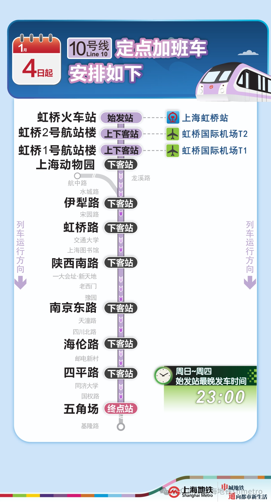 为进一步方便虹桥枢纽夜间到达乘客的出行,2025年12月31日起,2号线虹桥火车站站定点加班车停靠站点增加威宁路站。2026年1月4日起,10号线虹桥火车站站定点加班车停靠站点增加伊犁路站。另外,元旦返程期间17号线虹桥火车站站夜间定点加班车停靠站点也将增加徐盈路站。