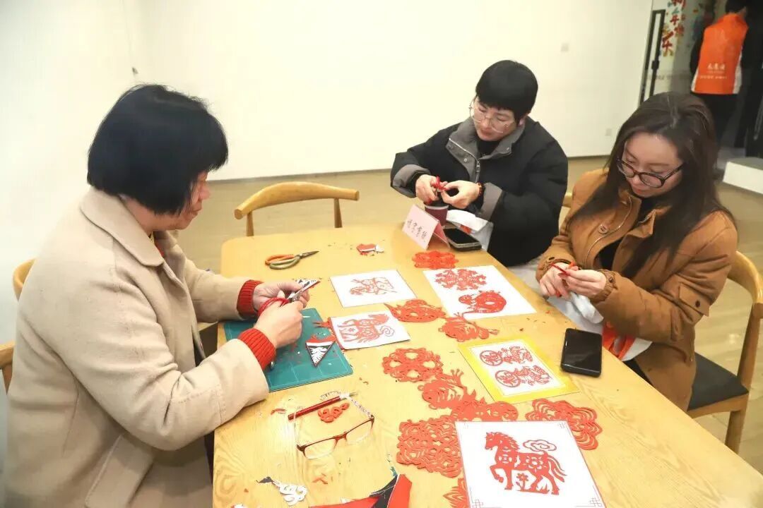 文化体验区墨香与匠心交织。许多劳动者第一次拿起毛笔,在老师指导下认真写下一个个饱满的“福”字;非遗螺钿胸针制作和“福”字剪纸摊位前也围满了人,大家细致摆弄着手中的材料,感受传统文化的独特魅力。