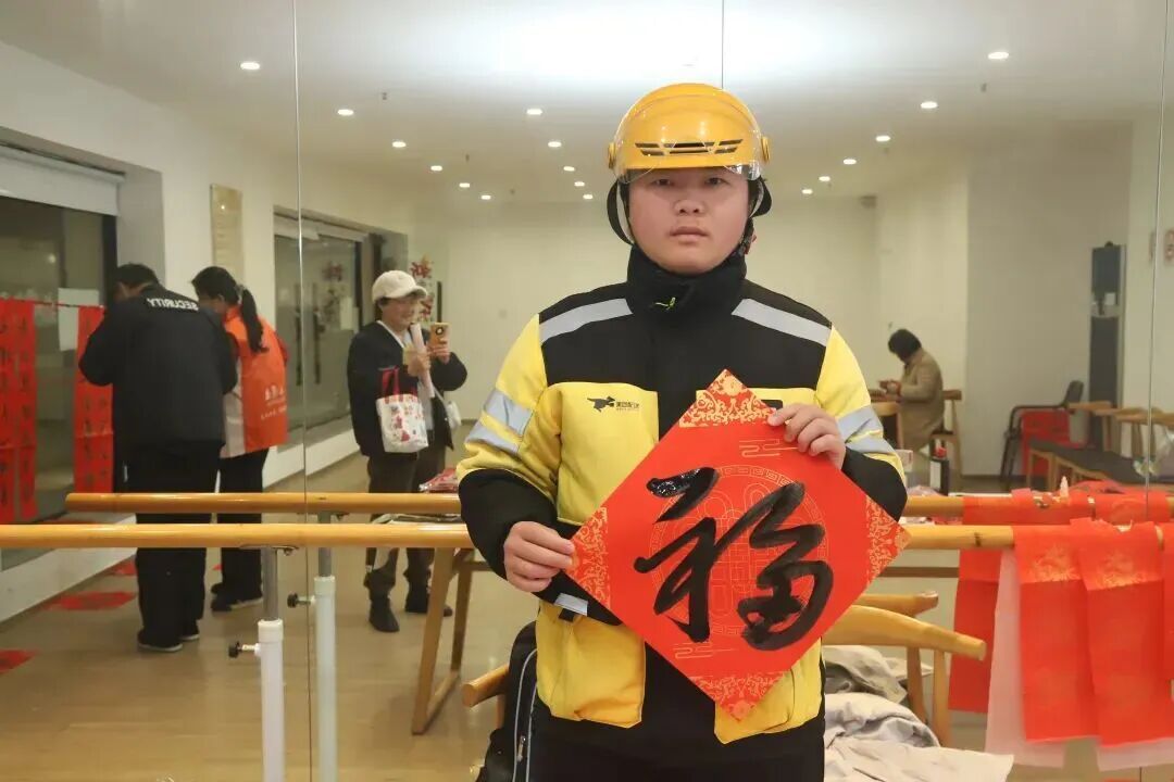 来自美团外卖的骑手小邓展示着自己的书法“首秀”。这一刻,他们不仅是城市的配送员,更是传统文化的体验者、美好生活的创造者。