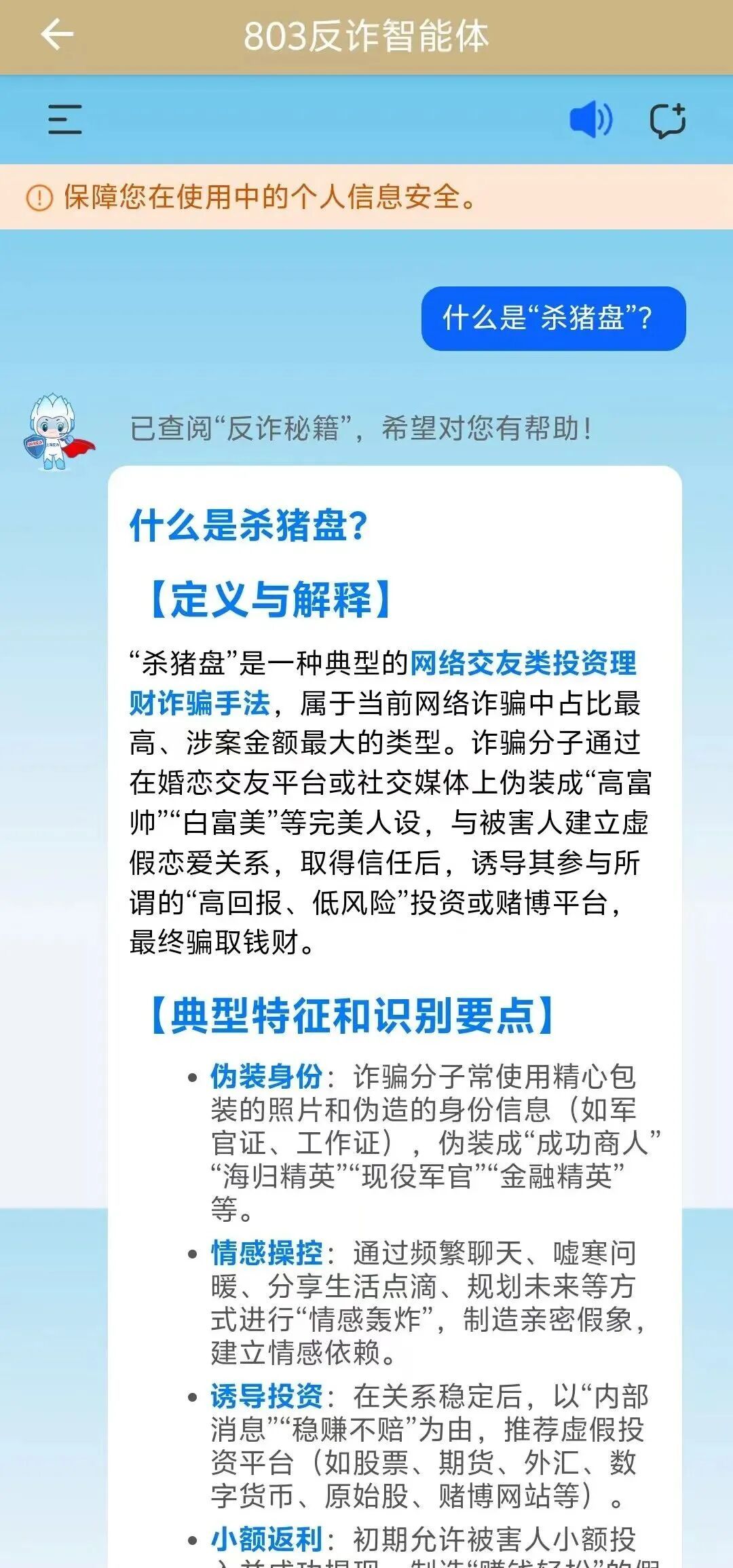 本次活动上线的“803反诈”智能体APP集反诈问答智能体、反诈资讯和反诈辞典于一体,以日常生活中的常见诈骗场景为基础,深度融合了AI大数据模型算法,可以通过“文字+语音”的形式为市民群众提供问答交互。如提问“QQ里有人给我发消息,说下载个APP就可以和美女视频聊天,我能相信吗?”智能体会给出相应的诈骗类型解析,并关联推送“803反诈”相关宣传视频。