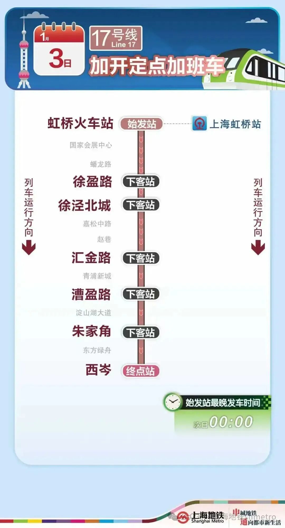 1月3日上海地铁2、17号线增开定点加班车