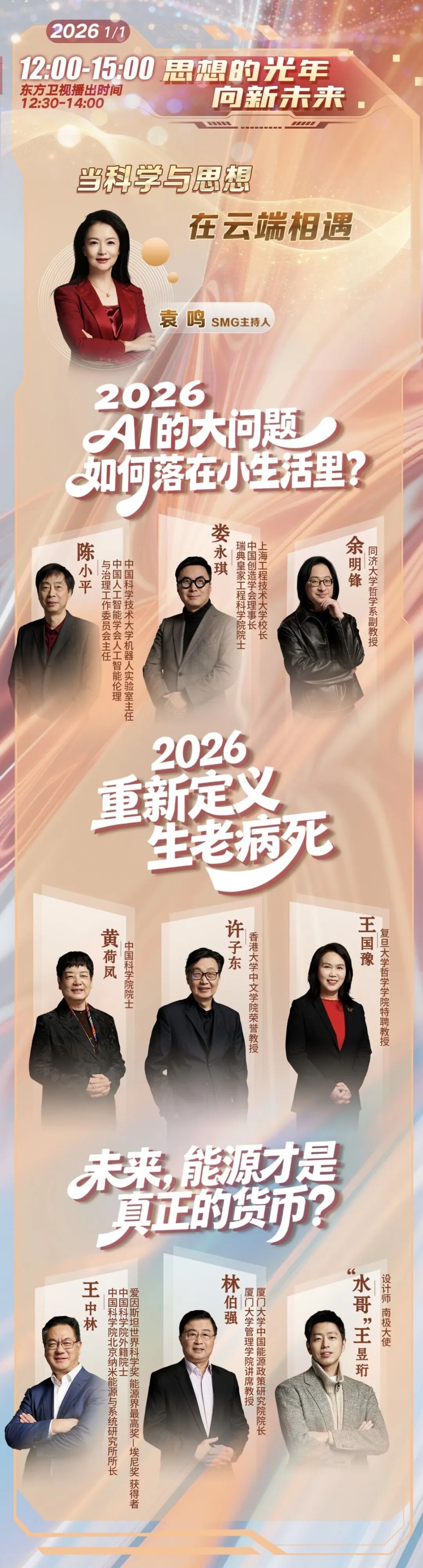 【即将开启】 思想的光年 向新未来 从山河秘境 来到科学与思想的云端, 看过“是什么”后, 更要追问“为什么”与“走向哪里”。 围绕生命、能源、智能 三大关乎人类未来的议题, 王中林、黄荷凤等顶尖科学家们 齐聚上海之巅, 即将展开 一场跨越学科的思想对话! 在这里, 宏大的科学议题 将照进我们每个人的生活。 TA们将共同探讨: AI的大问题如何落在小生活里? 如何重新定义生老病死? 未来,能源才是真正的货币? 在思想的光年中, 锚定人类前行的方向。 编辑:朱文莹