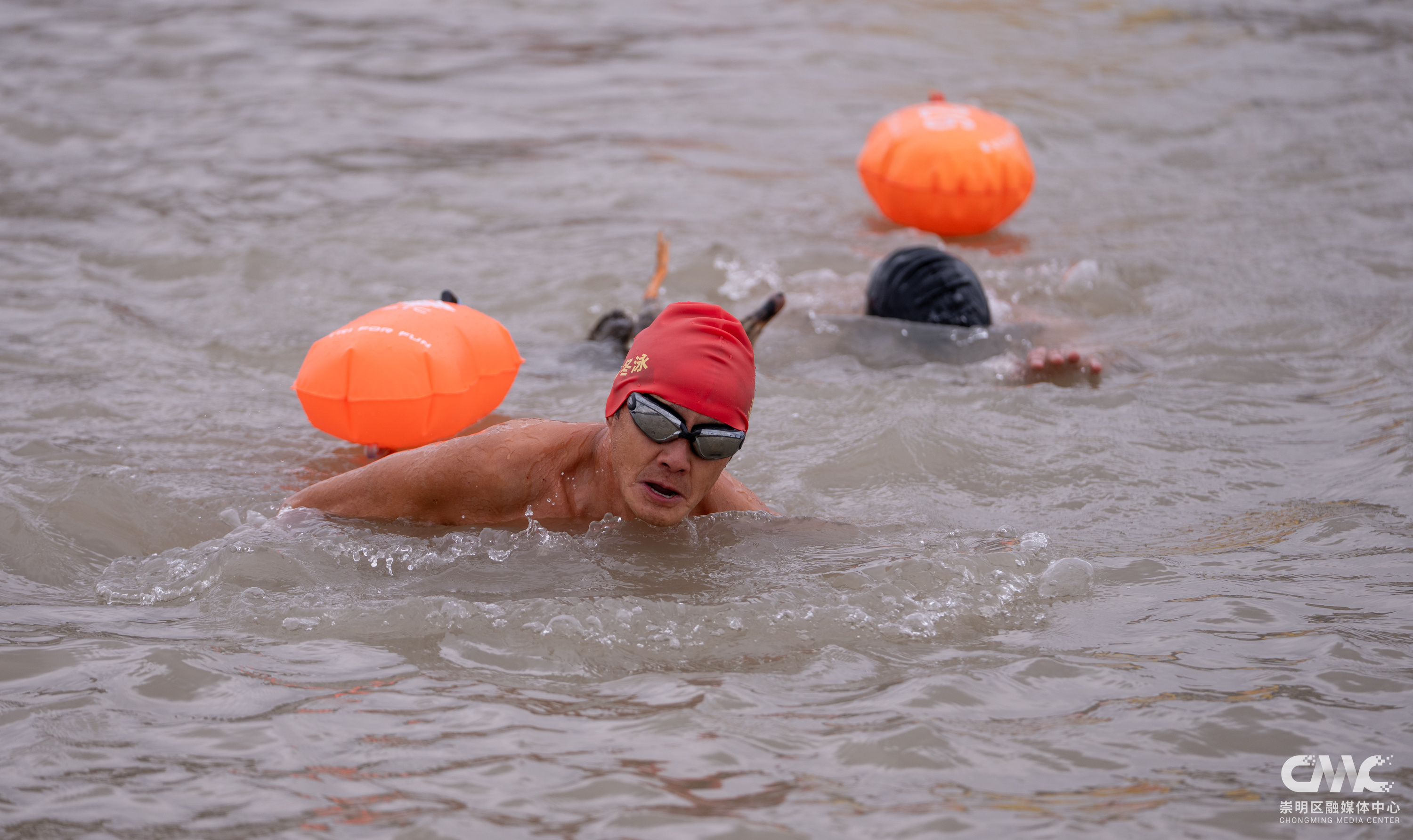 今天的崇明,天空还飘着小雨,体感温度接近零度。在简短的开幕式后,首先进行的是按年龄分组的200米畅游。只见选手们以各种泳姿跃入清澈冷冽的河水中,挥臂破浪,奋力向前,河面上划出一道道充满力量的涟漪。
