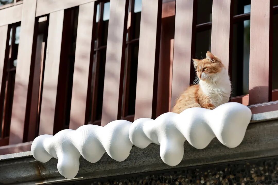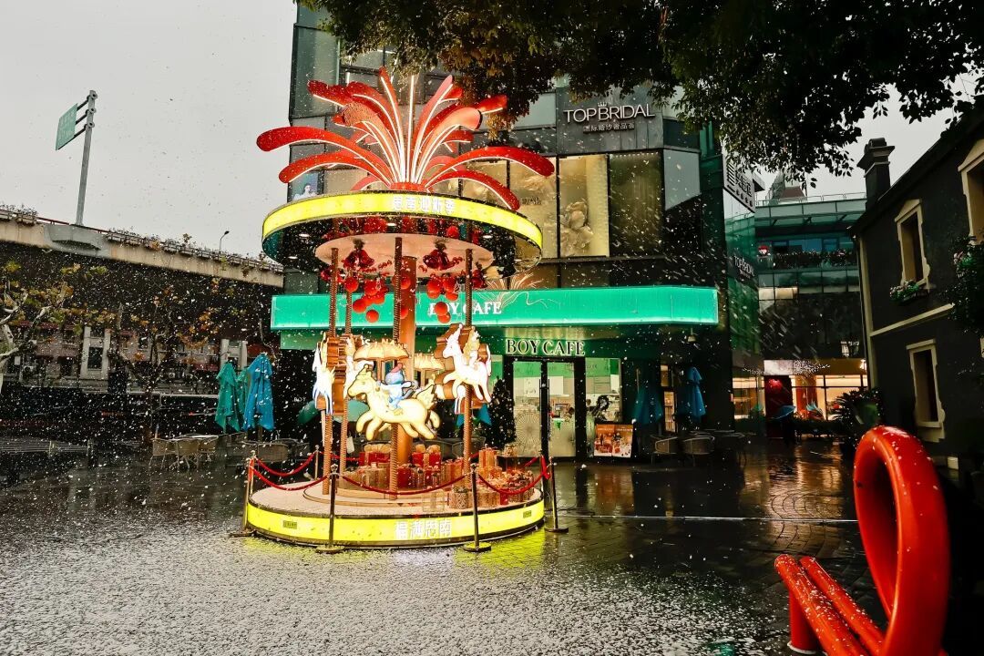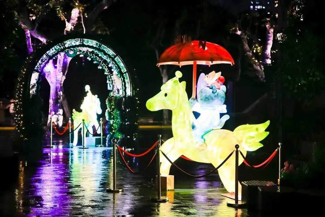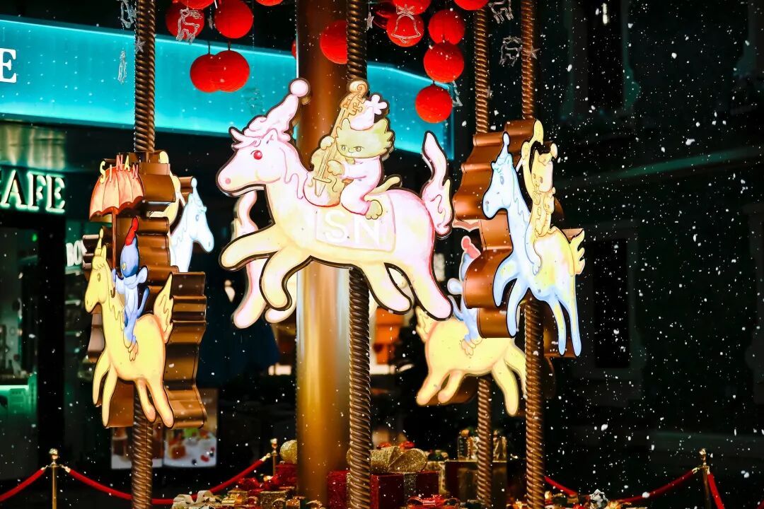 思南原创IP“橘BOSS”的加入,让灯光景观更具情感温度。围绕“希望、守护、美好”的马年愿景打造的“以梦为马”主题艺术装置,在重庆南路与小广场惊艳亮相。全新跨街美陈装置化身三盏“会呼吸的路灯”,白日是静谧的街角雕塑,入夜后内透微光,三只“骑马的橘猫”携着新年祝福悄然入驻街区。重庆南路广场的主装置特邀创作者焦健绘制“思南大橘”及其伙伴的温暖形象,旋转木马、闪亮星星与萌态可掬的“大橘”构成欢乐场景;思南小广场的迎新花艺则以松针绿植塑形,打造出软萌的立体“大橘”,成为街区最暖心的视觉名片。