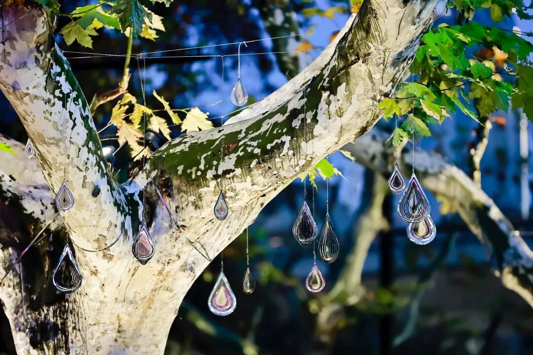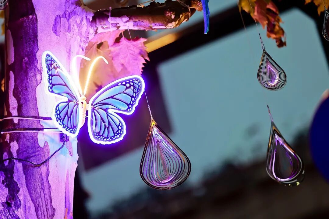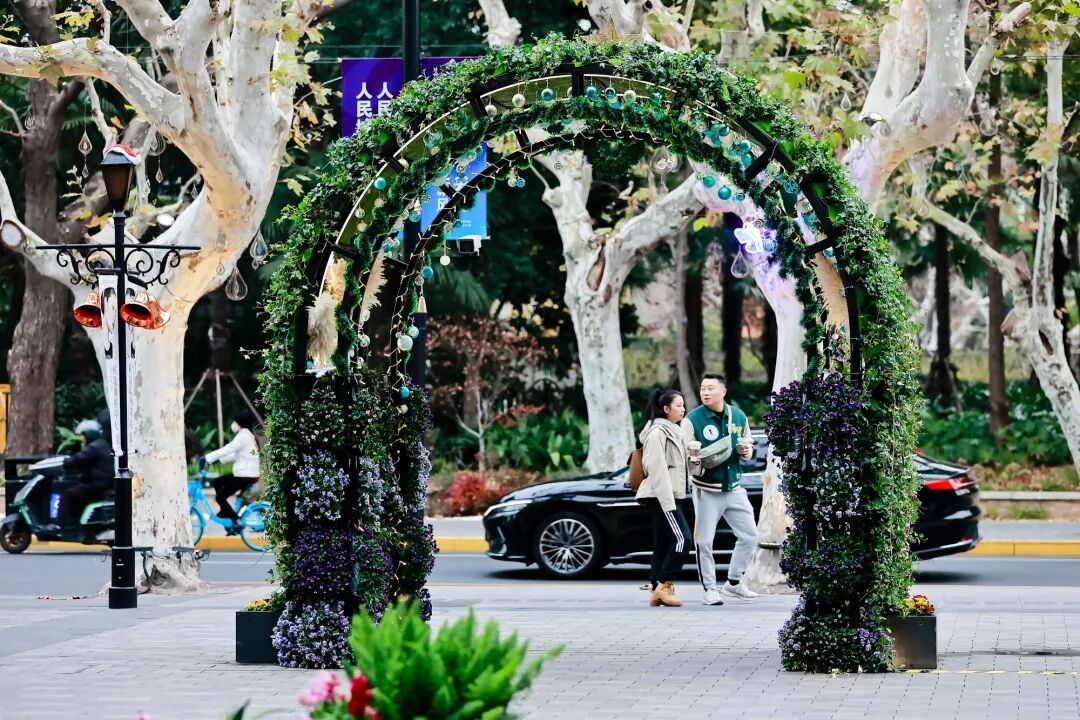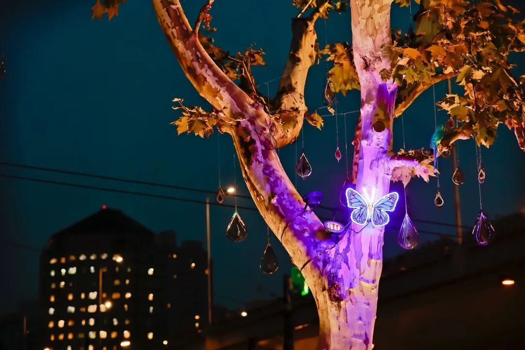 此次亮化工程堪称城市更新与夜景优化的生动实践,以“以点连线、以线连片”的手法,串联起复兴中路(思南路至重庆南路段)的街景与节点。复兴公园北侧全新亮相的紫藤花门浪漫雅致,与南侧思南公馆的梦幻灯街遥相呼应,让百年公园与历史街区在光影中完成温暖对话。设计师李中伟创作的“雨滴”艺术装置从复兴公园延伸至沿街梧桐树梢,夏日意象的雨滴凝结成冬日闪烁的晶莹雪花,星光点点的树木营造出“星雨洒落”的唯美视觉效果,为冬日街头注入浪漫氛围。