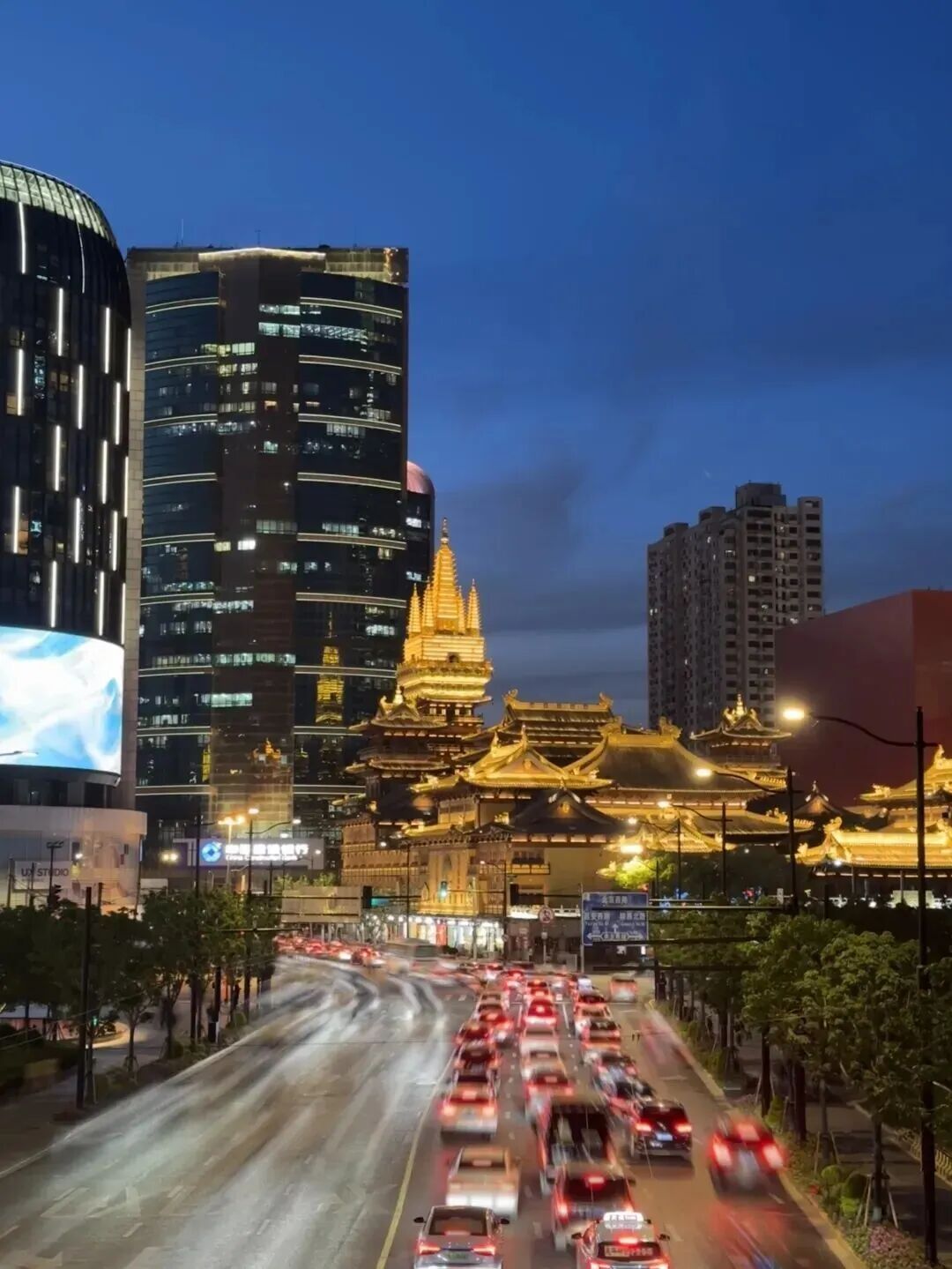 当千年古刹的琉璃金顶与延安高架的川流车轨同框,无论玩延时摄影,还是长曝光拍车轨,古典与现代都能在此碰撞出令人屏息的视觉奇观。