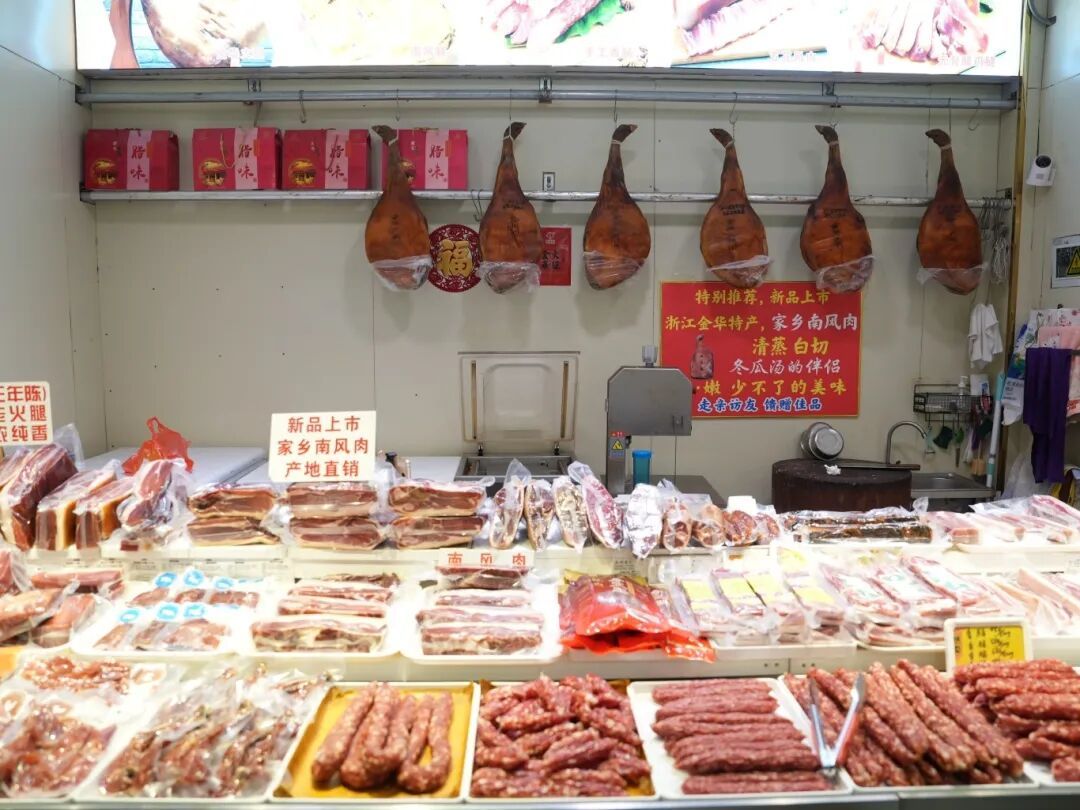 循着浓郁的咸香气味走进康兴市集,一家专营老字号腌腊的铺子格外引人注目——柜台里整齐悬挂着老字号品牌的咸肉、火腿与香肠,散发着经年累月的醇厚风味。店主一边招呼顾客,一边笑道:“如今不用特地跑南京路,在家门口就能买到这些老味道。”这些历经时光酝酿的咸鲜,如同一位如期而至的旧相识,默默为岁末年关添上第一笔温情。