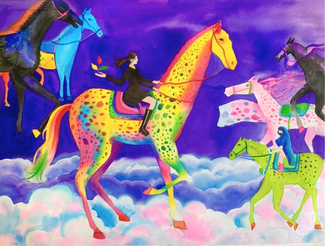 展厅内,六十余幅作品依次陈列,油画、水彩、素描、创意绘画等错落有致,让空间兼具美感与温度。入口处,合吾画舍主理人郑静的水彩画《热情·明媚·生机》堪称视觉焦点,画作以奔放的笔触与明艳的色彩,勾勒出一个充满奇幻与生命力的世界。画面中央,一位身着黑衣的女子手捧三色树叶红、黄、绿色分别对应着热情、明媚与生机,骑乘者于斑斓的斑点骏马之上,仿佛自然与灵性的使者。四周环绕着形态各异的马群——墨黑如夜、湛蓝似海,它们扬蹄跃动,与主体骏马交织成流动的韵律。背景中深邃的紫罗兰天空与粉白相间的云霞,交织出梦幻般的黄昏之境。整幅作品仿佛一曲视觉的颂歌,赞美着天地间肆意绽放的生机与明媚光华。