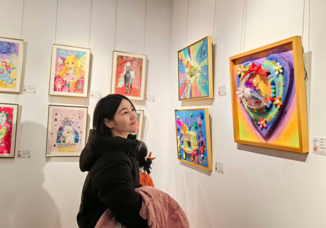 学生们的作品则充满了“天马行空”的创意,成为展厅里亮眼的风景线。除了水彩、彩铅这些常用的材质,布面、石英砂、羽毛、毛线、黏土等多元材料都被孩子们玩出了新花样。6岁小学员的《幻旅甜芯》用亚克力罩将一匹用彩色毛线作鬃毛的粉色小马罩在其中,宛若开启了一段太空旅行;12岁学员的《跃马踏春》,以布面为底,用石英砂混合颜料铺陈出蓬松的草地,又粘上彩色羽毛做马的鬃毛,阳光下羽毛熠熠生辉,仿佛小马正踏着春风奔向观众;还有孩子用黏土捏出立体的祥云与灯笼,点缀在画作边缘,让平面的画稿变成了可触摸的童趣世界。一幅幅色彩绚丽的作品充满童真与想象力,同时也拓展了绘画的边界,引得观展的家长和孩子们连连称赞。