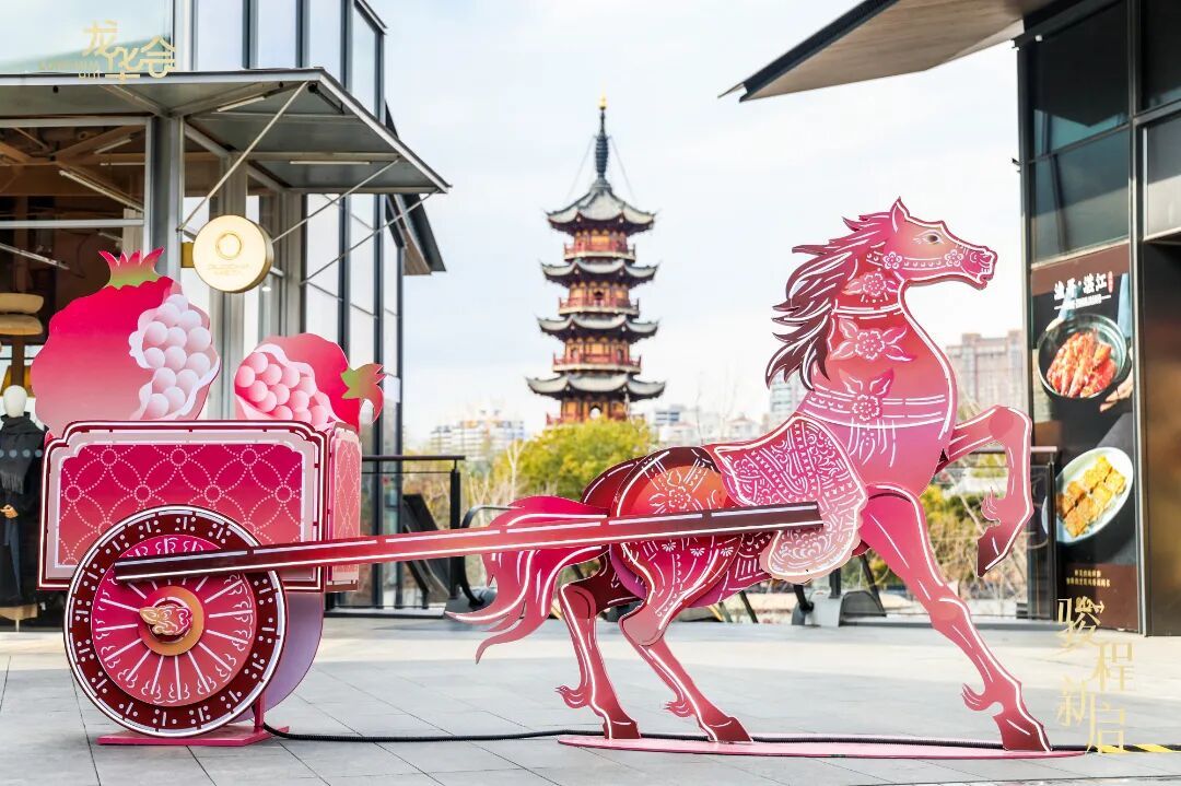 毕业于英国皇家艺术学院的混合媒体艺术家葛晓晨,将非遗皮影戏的光影语言与《八骏图》的东方美学解构重组,创作的公共艺术装置“丰景骏至”矗立在草坪主点位,骏马从光幕中脱影而出,仿佛奔行于虚实之间。散布在街区各处的艺术小品更串联起完整叙事动线:妙街上方,金色“铜钱滚灯”轻灵摇曳,将非遗技艺幻化为流动金光;后马路入口处,满载石榴与祝福的“收获”花车静候游人,海棠花窗透出的温柔灯光映着祥鸟报喜的剪影,让市民在漫步中不时与艺术惊喜偶遇。